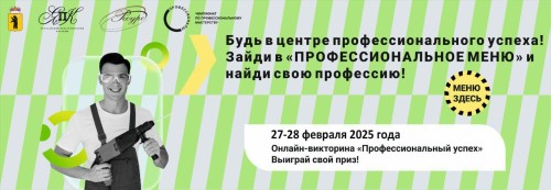 У вас есть отличная возможность присоединиться к Чемпионату по профессиональному мастерству «Профессионалы». Вы сможете узнать о профессиях из первых уст, познакомиться с тонкостями современных профессий, увидеть талантливых профессионалов и прикоснуться к их ценному опыту. С 25 февраля для вас будет открыт сайт «Профессионалы 2025» https://professionals.resurs-yar.ru/, в разделе сайта «Профессиональное меню» вы сможете познакомиться с 67 наиболее актуальными, востребованными и перспективными профессиональными компетенциями из 12 профессиональных сфер. Каждый день в период с 25 по 28 февраля на сайте будут размещаться красочные видеоролики по каждой из компетенций, посмотрев которые, вы сможете узнать полезную информацию напрямую с площадок и оценить привлекательность видео «лайком». Старшеклассники, не упустите возможность в период с 27 по 28 февраля принять участие в Онлайн-викторине «Профессиональный успех», продемонстрировать полученные знания о профессиях и выиграть один из уникальных призов.
